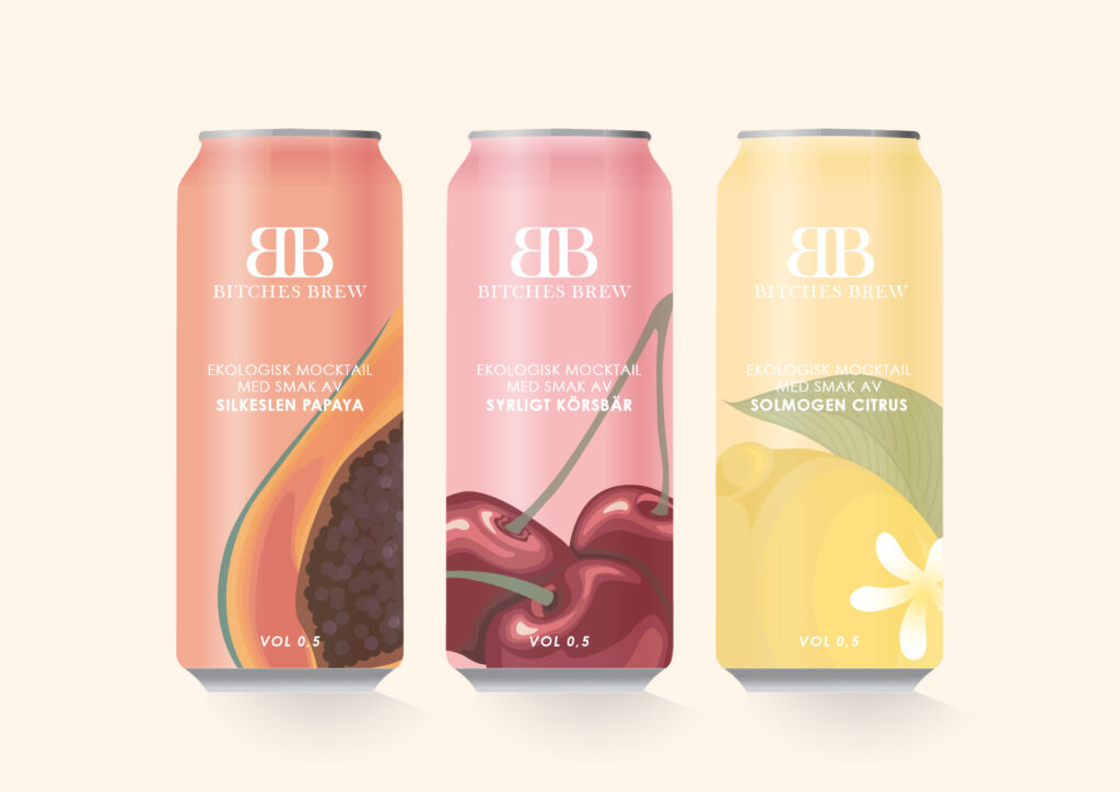 Syftet med projektet var att ”Skapa förpackningsdesign för det fiktiva varumärket Bitches Brew som lanserar tre olika mocktails för dagligvaruhandeln.” Alla illustrationer är skapade i Adobe Illustrator.