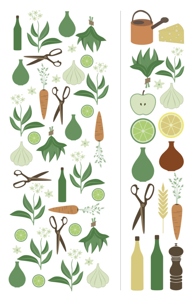 Logotyp och Illustrationerna är skapade i Adobe Illustrator. Ritningen är skapad i Artios CAD. Förutom de illustrationerna som bildar mönstret skissades det fram några ytterligare.